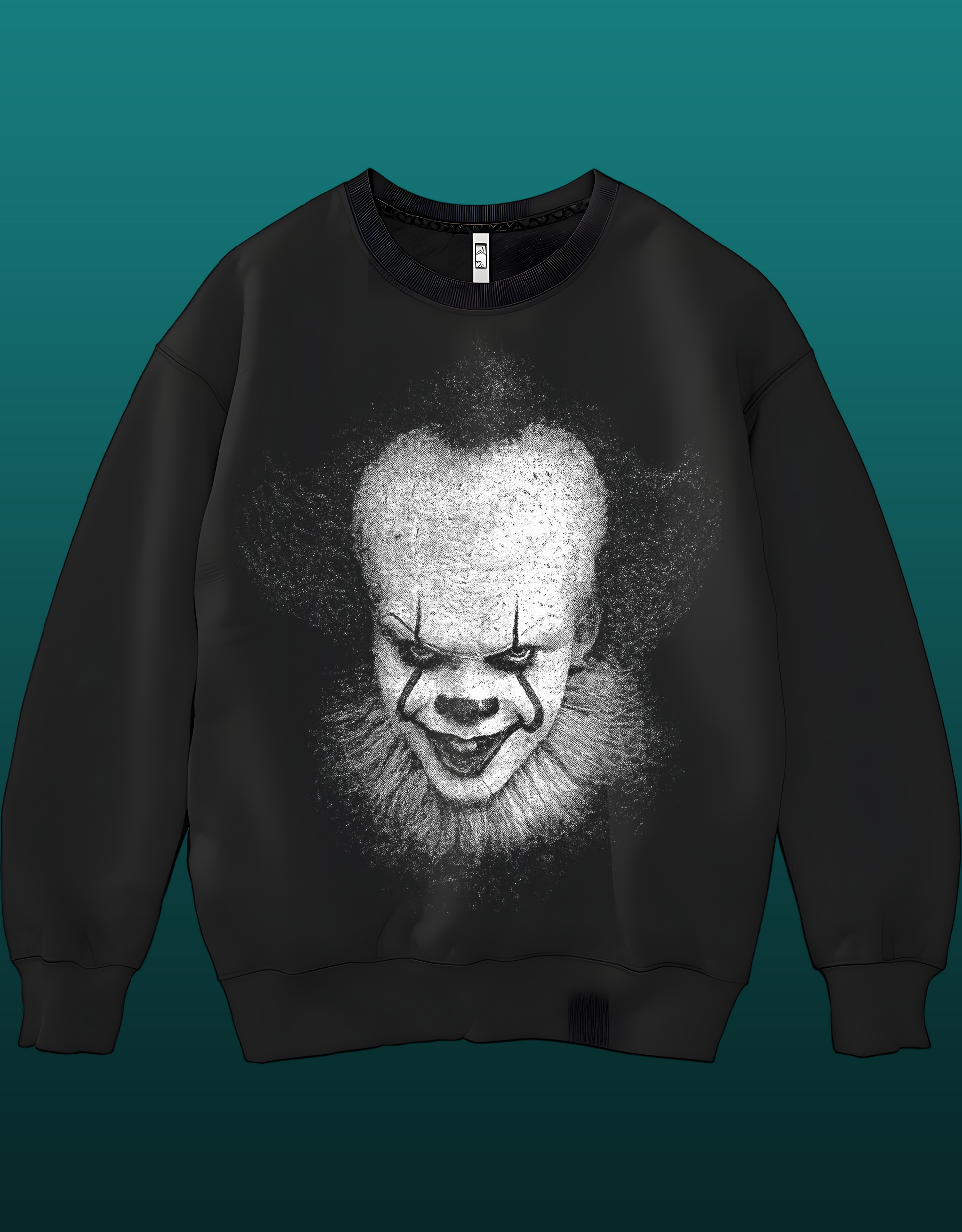 Float into the spotlight with this all-black sweatshirt featuring a chilling graphic of the Dancing Clown. Equal parts creepy and stylish, this piece brings horror vibes straight to your streetwear rotation. Made from a soft cotton-blend for comfort and durability, it’s perfect for anyone who isn’t afraid to stand out.